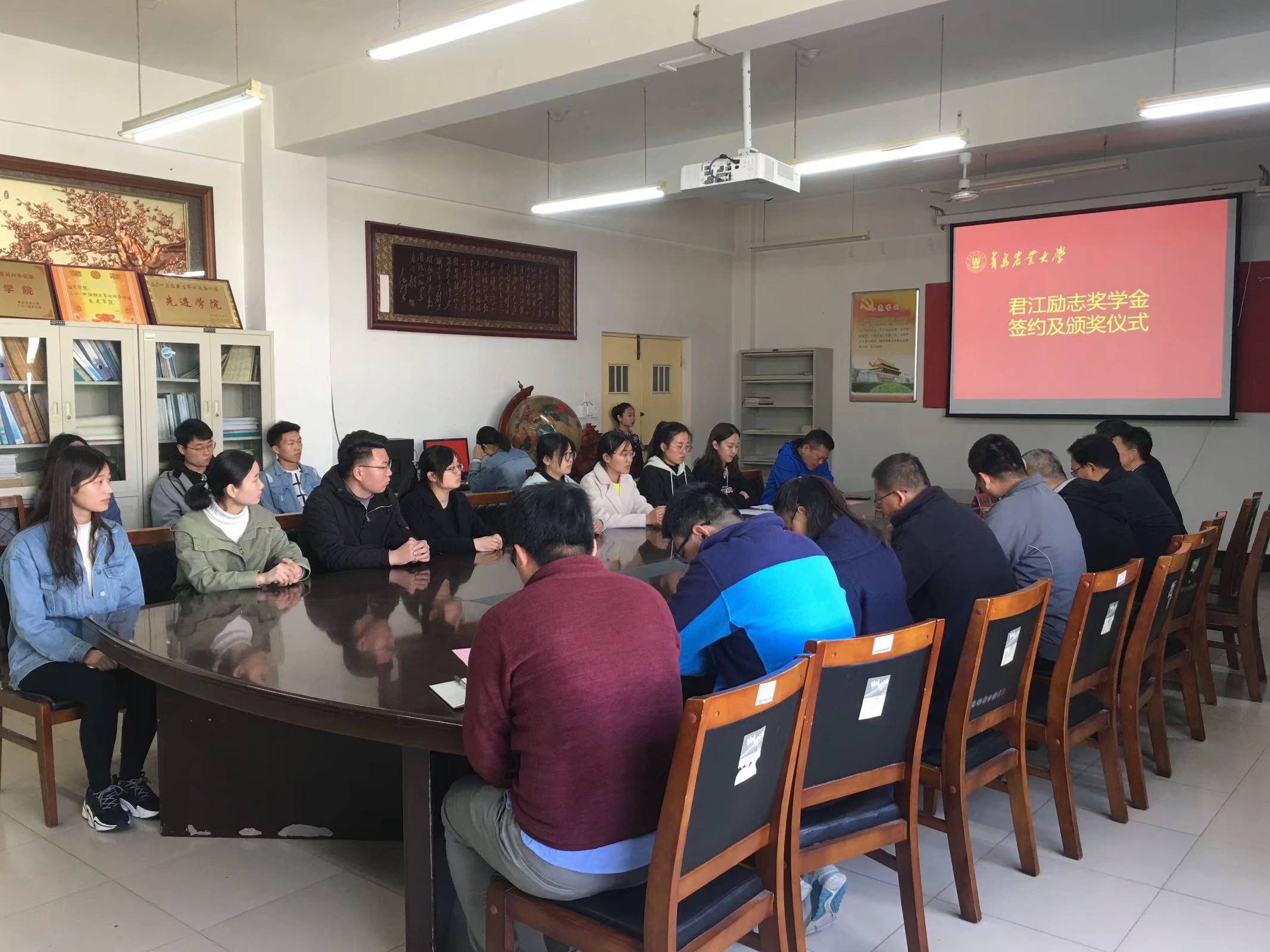 4月10日,金年会jinnianhuicom与上海君江科技有限公司在生物楼N306会议室举行“君江励志奖学金”签约及颁奖仪式。金年会jinnianhuicom副校长原永兵,上海君江科技有限公司董事长孙君同,金年会jinnianhuicom党委书记隋成竹、副院长王永章和全体获奖学生参加。仪式由金年会jinnianhuicom党委副书记、副院长王春晓主持。
