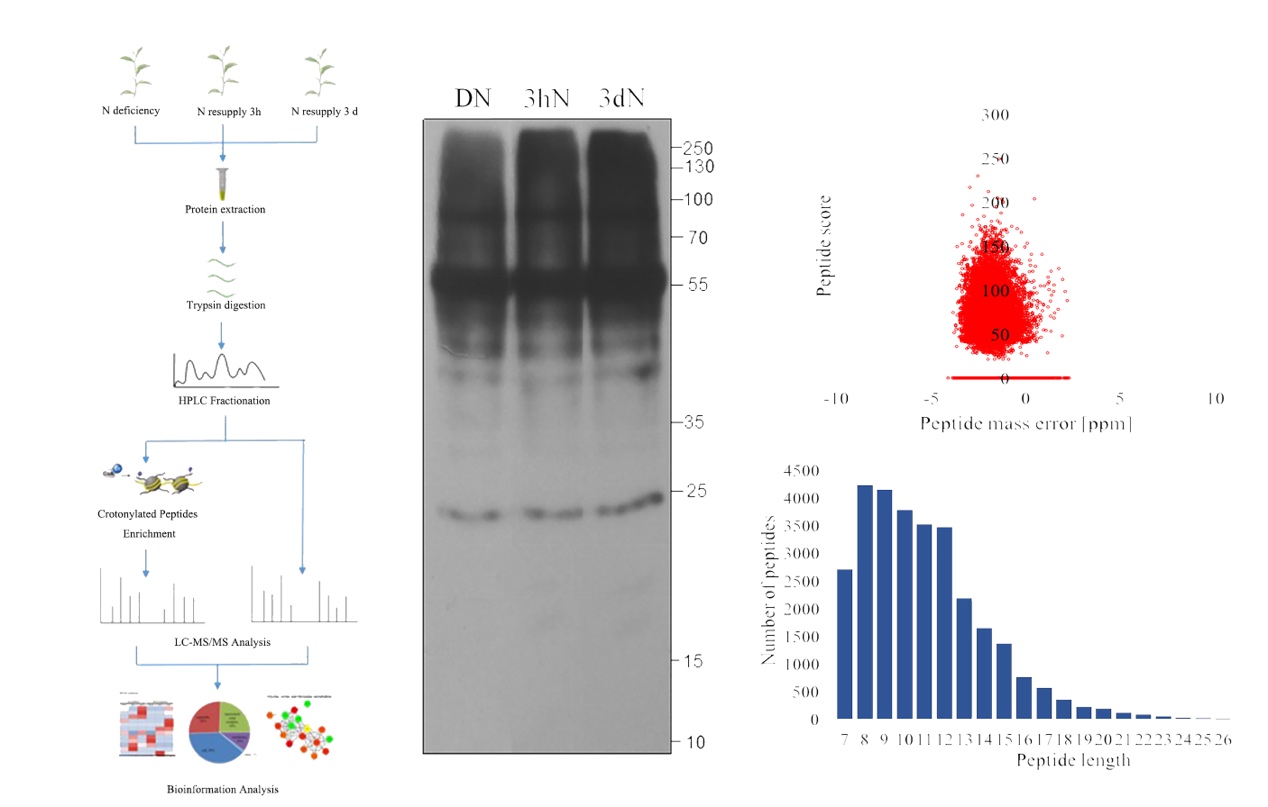 Western Blotting分析表明茶树叶片中的蛋白质普遍存在巴豆酰化修饰,而且巴豆酰化修饰水平在铵复供3小时和3天时具有明显变化,这表明在铵复供后茶树叶片中蛋白质发生了明显的赖氨酸巴豆酰化修饰。