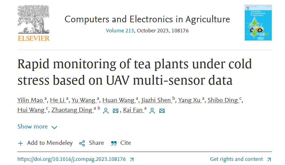 2023年8月27日,金年会jinnianhuicom在Computers and Electronics in Agriculture (中科院1区TOP期刊,IF = 8.3)发表了题为“Rapid monitoring of tea plants under cold stress based on UAV multi-sensor data”的研究论文。金年会jinnianhuicom青年教师范凯博士和山东省农业科学院茶叶研究所丁兆堂教授为论文共同通讯作者,金年会jinnianhuicom茶学专业在读硕士研究生毛艺霖为第一作者。该研究得到了山东省现代农业产业技术体系首席专家项目、山东省农业良种工程项目、山东省农业科学院创新项目和山东省泰山学者专项基金等的资助。