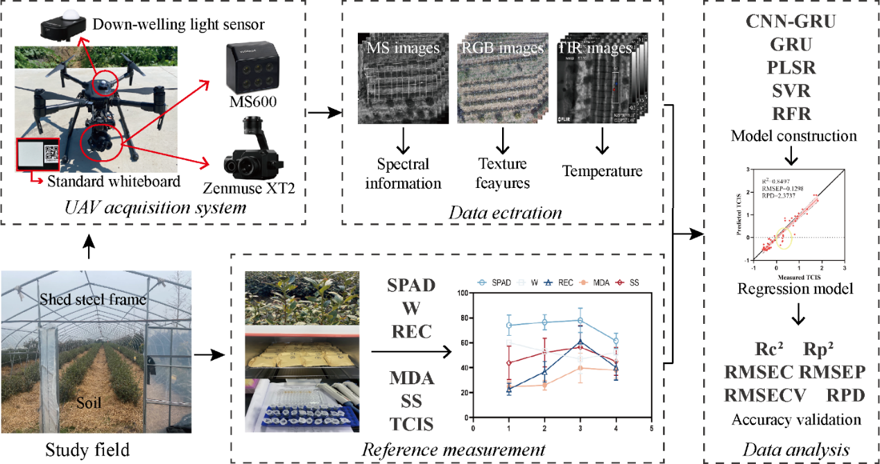 在这项研究中,作者利用无人机搭载多光谱(MS)、热红外(TIR)和RGB等传感器,采集自然越冬茶园不同时期的多模态遥感数据,并获取当天茶树叶片的生理数据,构建茶树冻害指数(TCIS)。然后,建立了一种混合卷积神经网络-门控循环单元(CNN-GRU)模型,用于估算TCIS。此外,作者为了更好的比较CNN-GRU的性能,还使用了单个GRU模型和另外三个经典机器学习模型进行比较。该研究发现:(1)多模态数据融合优于单模态数据。其中,双模态MS+RGB组合数据取得了最佳的预测结果(Rp2=0.862, RMSEP=0.138, RPD=2.220);(2)CNN-GRU混合模型优于另外四个基线模型,分别在MS+RGB(Rp2=0.862)或MS+RGB+TIR(Rp2=0.850)的多元变量输入的基础上实现了最佳效果;(3)剔除土壤背景等非茶树冠层特征后的模型精度低于未去除背景的模型精度。