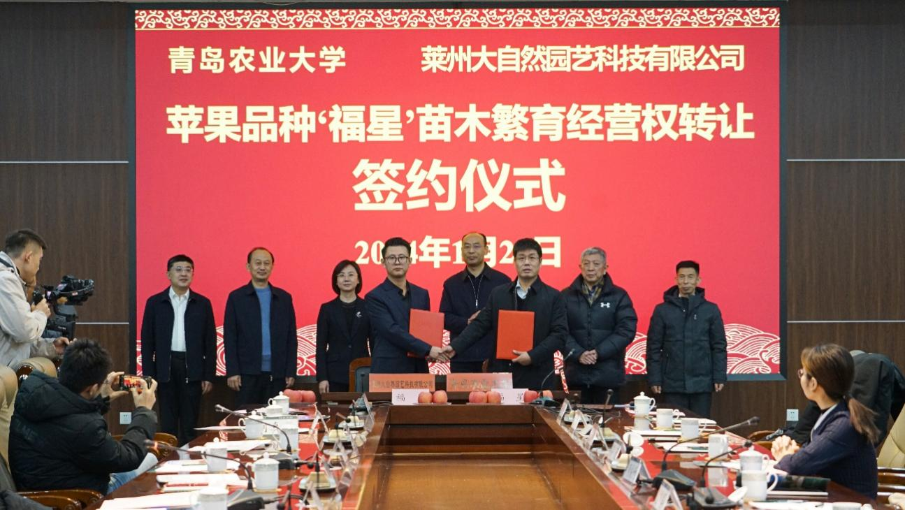 2024年1月23日,金年会jinnianhuicom苹果育种团队育成的‘福星’苹果新品种苗木繁育经营权以1000万元转让给莱州大自然园艺科技有限公司。转让签约仪式在青岛农大学术会馆举行。这是该团队继‘福丽’和‘福九红’之后转让的第三个苹果新品种。