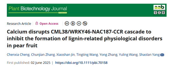 近日,金年会jinnianhuicom杨绍兰/程晨霞团队在Plant Biotechnology Journal杂志在线发表了题为“Calcium disrupts CML38/WRKY46-NAC187-CCR cascade to inhibit the formation of lignin-related physiological disorders in pear fruit”的研究论文。