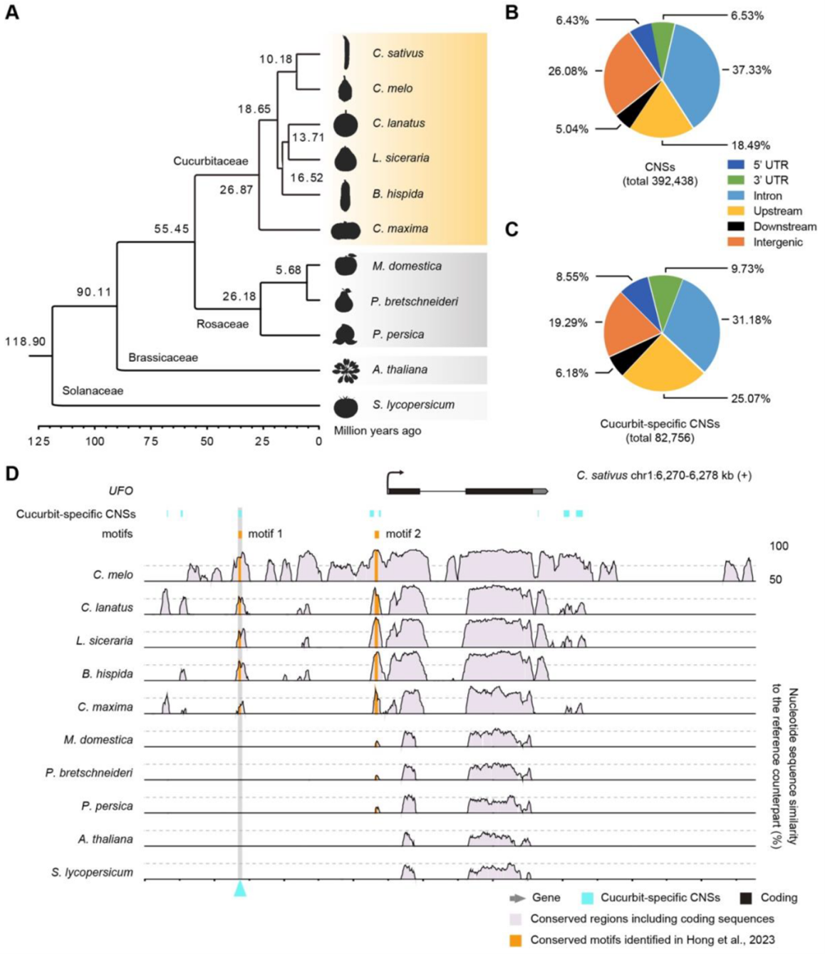 研究人员首先对6个葫芦科物种(黄瓜、甜瓜、西瓜、葫芦、冬瓜和南瓜)、3个蔷薇科物种(苹果、梨)、1个茄科物种(番茄)和模式物种拟南芥全基因组进行了系统的比较基因组分析,鉴定了39万个保守的非编码区调控元件序列区域,其中8万个为葫芦科特有,可能调控葫芦科物种的特异性状(图1),这为研究果实发育和葫芦科特异性状提供了候选的调控元件序列区域。