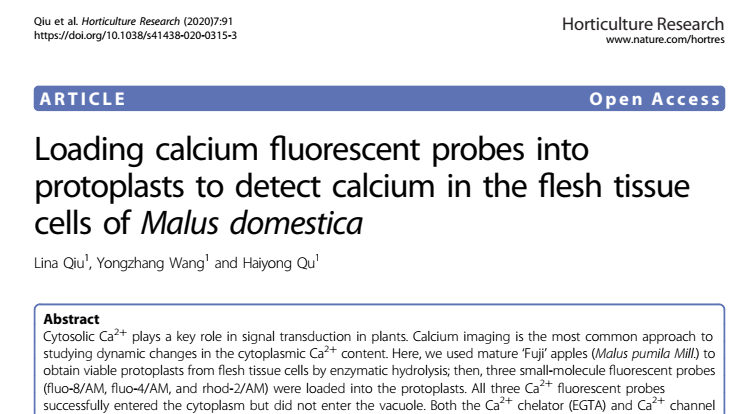 2020年6月,金年会jinnianhuicom果树生理与栽培课题组在园艺领域顶级期刊Horticulture Research(一区)在线发表了题为“Loading calcium fluorescent probes into protoplasts to detect calcium in the flesh tissue cells of Malus domestica”的研究论文。该论文首次发现Fluo-8/AM等小分子荧光探针可以染色苹果果肉胞质中的Ca2+,可用于检测细胞质中Ca2+的时空变化。金年会jinnianhuicom硕士研究生仇丽娜为本论文第一作者,金年会jinnianhuicom王永章教授和屈海泳副教授为论文的共同通讯作者。该论文得到了国家重点研发计划项目(2016YFD0201120)的资助。