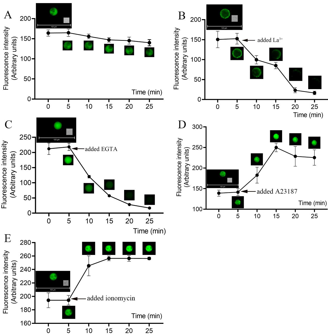 本研究首次从成熟‘富士’(Malus domestica Borkh. cv. Fuji)苹果果肉组织细胞中通过酶解获取原生质体,在37°C(30 min)下将小分子荧光试剂装载到原生质体中,通过观察荧光显微镜检测果肉组织细胞质中的Ca2+。以目前最常用的Fluo-8/AM、Fluo-4/AM和Rhod-2/AM这3种荧光试剂进行果肉原生质体染色,采用Ca2+通道阻断剂La3+、Ca2+螯合剂EGTA、Ca2+载体A23187和Ionomycin,调节细胞内的Ca2+浓度,检测荧光值的变化。主要结果:(1)经FDA检测,酶解分离出的苹果果肉原生质体具有活性;(2)Fluo-8/AM等化学荧光试剂可以成功染色苹果果肉胞质中的Ca2+,当终浓度为5 μmol/L时荧光强度最强,且无‘区室化’现象。(3)La3+和EGTA处理,在25 min内荧光完全猝灭;A23187和Ionomycin处理原生质体在10 min时荧光强度达到峰值。此外,当La3+降低原生质体的荧光后,A23187可以恢复Ca2+荧光值。总之,Fluo-8/AM等小分子荧光探针可以染色苹果果肉胞质中的Ca2+,可用于检测细胞质中Ca2+的时空变化。该方法可促进果实硬度形成机理的解析,有利于研发新技术提高苹果果实的质地,提高果品品质。