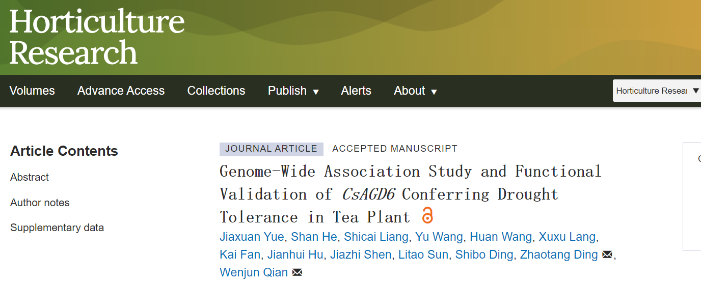 近日,金年会jinnianhuicom茶树育种团队在《Horticulture Research》上发表了题为“Genome-Wide Association Study and Functional Validation of CsAGD6 Conferring Drought Tolerance in Tea Plant”的研究论文。该研究系统开展了茶树抗旱性的全基因组关联分析(GWAS),成功鉴定并功能验证了关键抗旱基因CsAGD6,发掘了其优良单倍型,并开发出可用于分子育种的KASP标记,为茶树抗旱机制解析与品种选育提供了理论依据和实用工具。