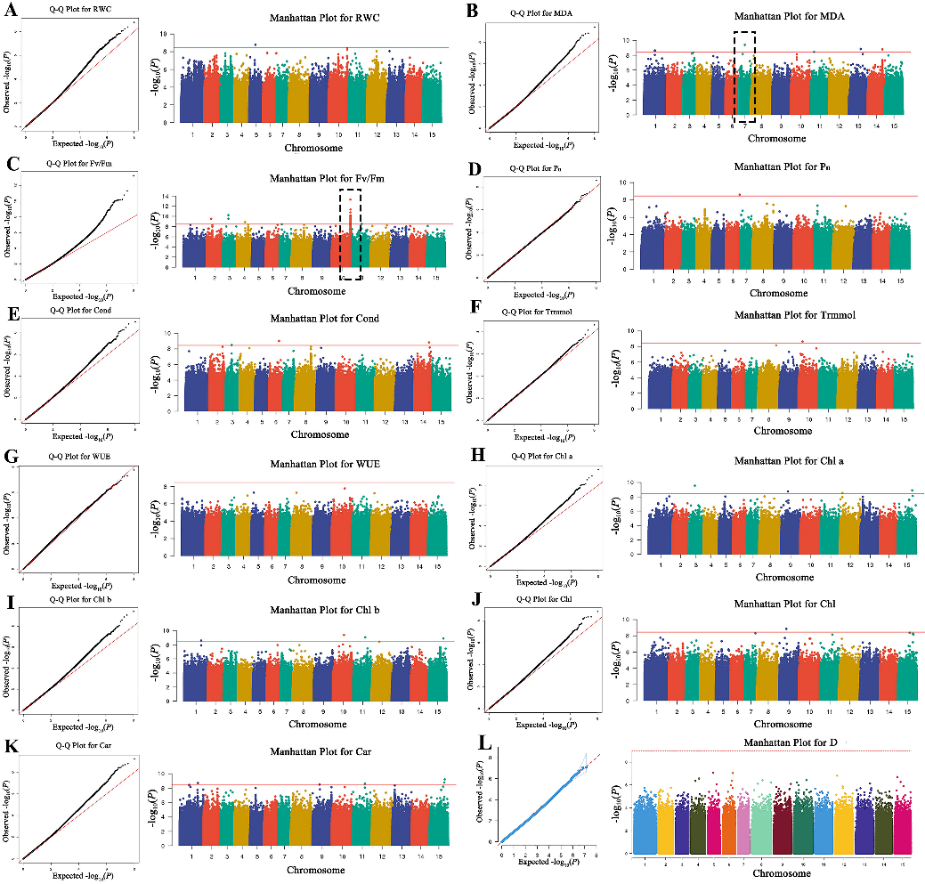该研究通过对115份茶树种质资源进行11项生理指标测定,结合主成分分析与隶属函数法构建了综合抗旱指数(D值)。基于全基因组重测序数据,利用线性混合模型开展GWAS分析,共鉴定到67个与抗旱性状显著相关的SNP位点,并在其50 kb上下游区域内筛选出4个候选基因,其中包括位于10号染色体的CsNHX1与CsAGD6,以及位于7号染色体的两个抗病相关基因。