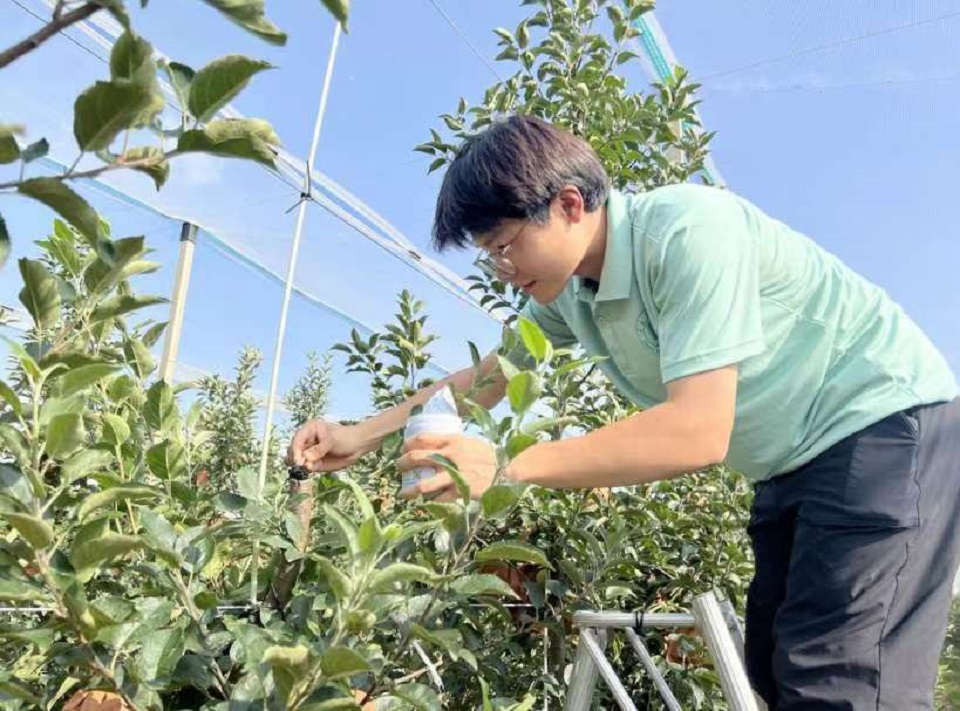 图为实践队员为苹果树剪口涂抹愈合剂 刘瀚阳摄