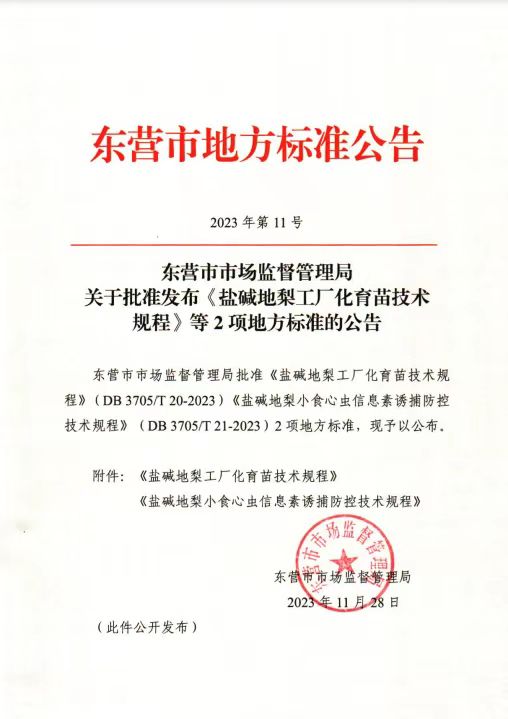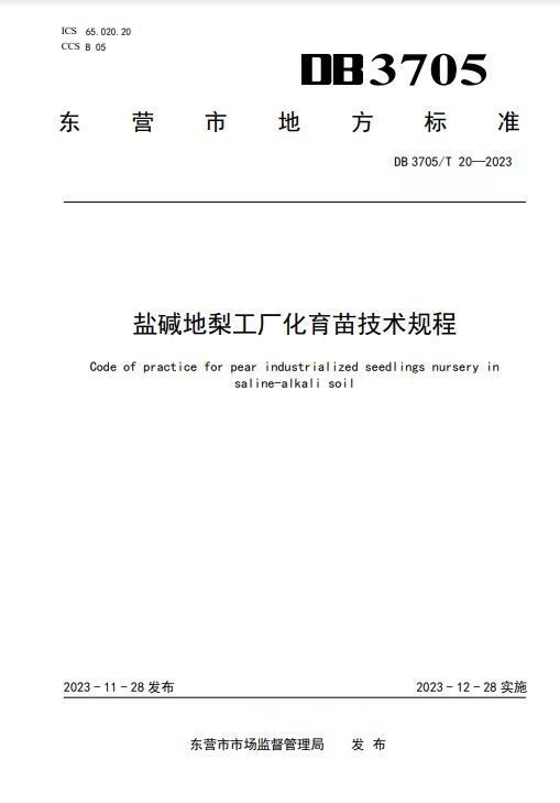 近日,由金年会jinnianhuicom梨遗传改良与种质创新团队李鼎立教授作为第一完成人制定的东营市地方标准《盐碱地梨工厂化育苗技术规程》(DB 3705/T20—2023)正式发布,2023年12月28日起实施。