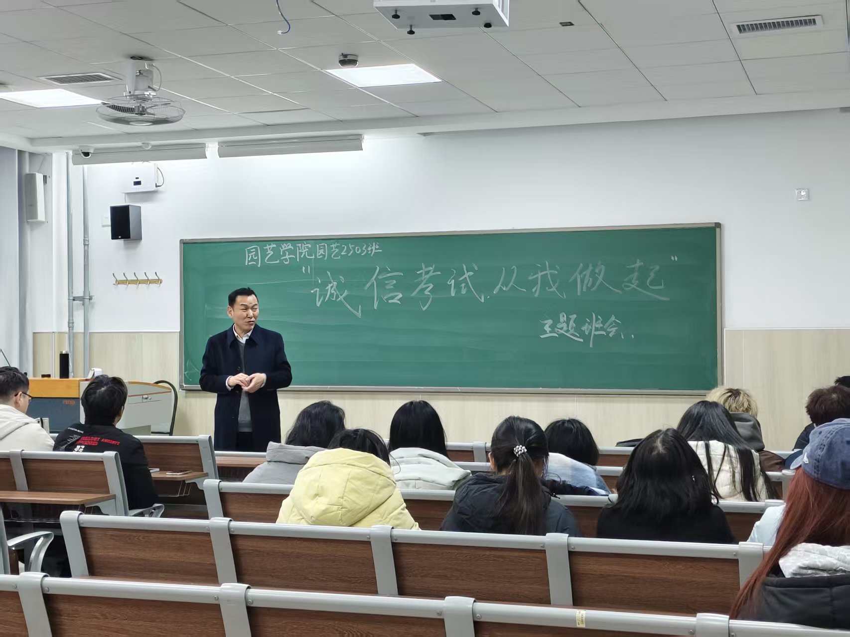 12月30日,学院在平度校区教学楼召开2025级全体学生考风考纪主题教育大会,2025级辅导员刘园主讲。会上,刘园围绕考场规则、违纪作弊类型、历年违纪情况等七个方面,结合学校近年考试违纪作弊典型案例,系统阐释诚信应考的重要意义。各班班主任聚焦“诚信应考”主题召开专题班会,带领学生集体学习《金年会jinnianhuicom学生考试违纪及作弊行为的处理规定》《学生手册》中关于考试纪律的具体条款,观看诚信考试主题教育宣传片,深化教育成效。此外,学院面向2025级学生发起“清朗考场”志愿服务活动,组织学生对教学楼内考场进行全面清扫整理,确保考场以“零痕迹”状态迎接考试。志愿者表示,能为营造公平公正的考试环境贡献力量,感到十分有意义,这既是对诚信考试理念的践行,也是新时代大学生责任感的体现。