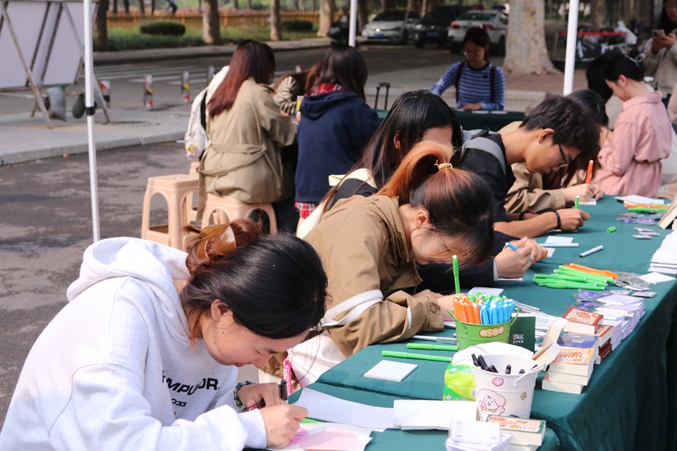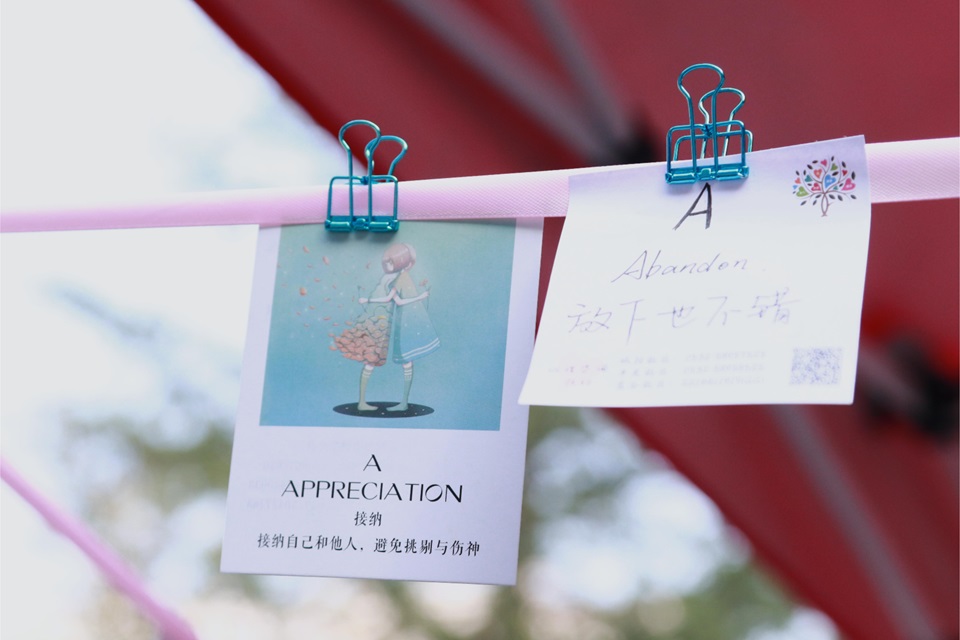 活动现场设置了“明心”“书心”等多个活动区域,以别出心裁的活动形式,引导学生探索情绪管理和压力应对的多重路径。“压力,拜拜”区域集中展览了“减压26式”卡片,从A到Z,每个字母都代表着特定的减压方式,不少同学创意定义了自己的个性化减压方案,将积极的生活态度传递给身边的同学。工作人员引导同学们感受情绪、记录情绪、书绘情绪,逐步学习走近情绪、认识情绪、接纳情绪。现场,每位参与活动的师生都领取到了精美的礼品,通过艺术化的形式“以美润心”,帮助同学们更好地理解和表达自己的情感。