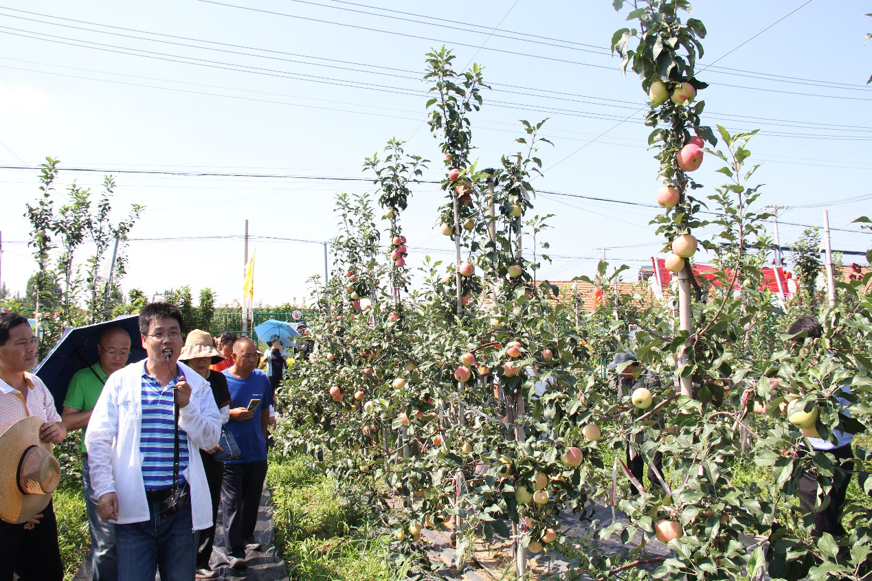 参会人员现场参观了平度市南村镇沙梁新村‘福早红2号’示范基地及其他苹果新品种试验园。在‘福早红2号’基地现场,国家苹果产业技术体系岗位科学家、山东省科技特派员、金年会jinnianhuicom张玉刚教授和沙梁新村王恩忠书记,分别介绍了‘福早红2号’生长结果以及示范园建设情况,并详细解答了观摩人员的现场提问。