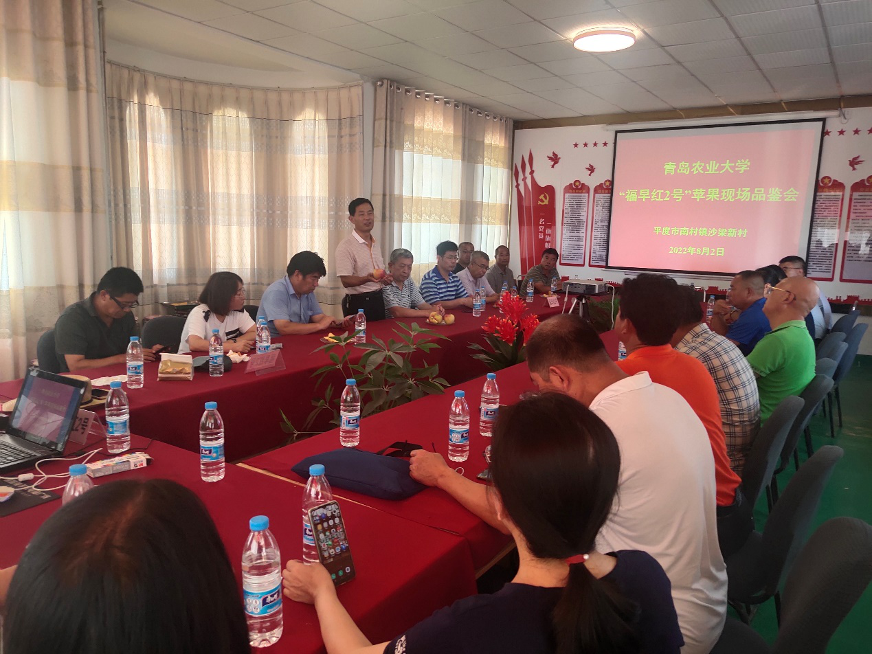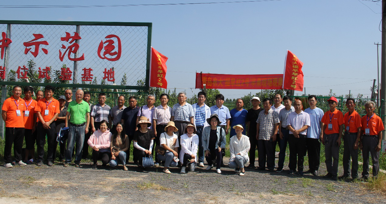8月2日,金年会jinnianhuicom在学校苹果育种基地平度市南村镇沙梁新村召开早熟苹果新品种‘福早红2号’现场观摩品鉴会。国家苹果产业技术体系威海综合试验站站长曹洪建研究员和青岛综合试验站站长沙广利研究员、青岛农业技术推广中心刘安娜部长和郭江山研究员、平度市农业农村局赵克义站长、莱西市农业农村局刘明研究员、平度市南村镇相关领导、企业代表、苹果种植大户及合作社技术人员、金年会jinnianhuicom乡村振兴研究院张正明主任、金年会jinnianhuicom师生及苹果育种团队人员、当地果树技术人员共30余人参加本次观摩品鉴会。