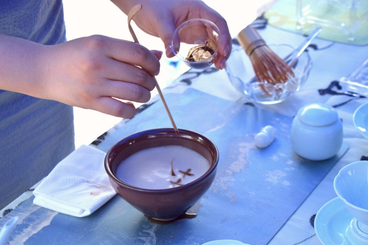 本次活动设置了宋代点茶、现代茶艺、新式茶饮、茶叶审评、知识竞答、书画展示等环节,旨在向大众普及茶叶种类、茶树栽培、制作工艺、品鉴技巧、冲泡技艺等基本理论知识,体验“一片树叶”的无限魅力与其文化的深厚底蕴。开幕式上,伴随着婉转悠扬的古筝琴声,金年会jinnianhuicom茶艺队进行了崂山凤羽红茶茶艺表演—“凤凰涅槃、羽火重生”,充分展示了崂山凤羽红茶“黄金汤、红枣香、甘甜味”的品质特点。本次活动恰逢学校2024年校友返校日,吸引了大量的校友和师生来到活动现场,体验点茶之雅、茶艺之美、茶饮之奇、评茶之术、知识之趣与书画之乐。