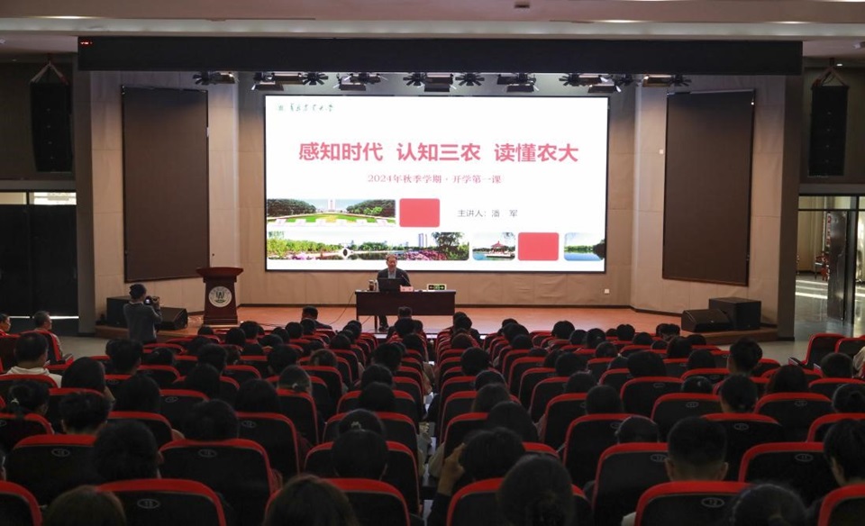 为帮助2024级本科新生适应大学生活,引导广大青年学生厚植知农爱农情怀,树立远大志向,10月11日,校党委书记潘军于平度校区博学楼报告厅为金年会jinnianhuicom和海洋科学与工程学院2024级全体本科新生讲授了以“感知时代 认知三农 读懂农大”为主题的秋季学期开学第一课。
