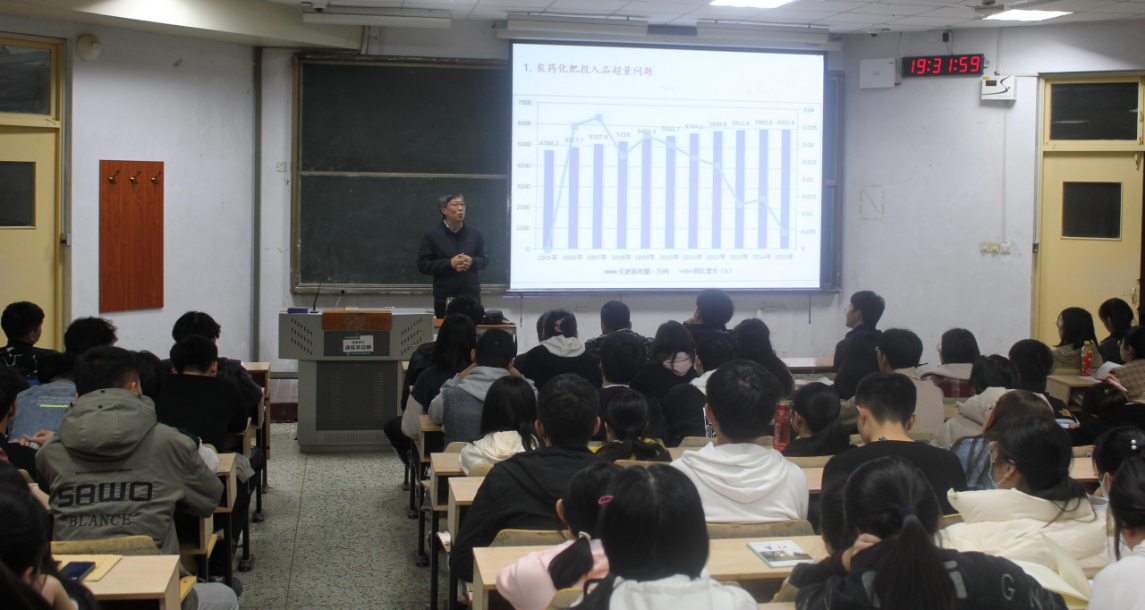 程斐从中国食品数量安全、食品质量安全、农村劳动力老龄化、地缘政治四个方面为同学们详细介绍了中国的农业安全机遇与挑战。他指出,我国粮食产量不断地增长,但是我国粮食仍然大量的依赖进口,进口粮食势头猛增;我国在食品质量安全中也存在许多问题,农药化肥投入量超量问题尤为突出;农村劳动力老龄化严重,在近十年,农村老龄化进一步加快;在地缘政治中,一带一路是我国的粮食和石油进口的重要途经,另外我国新疆喀什等地区的农业发展前景也非常值得期待。