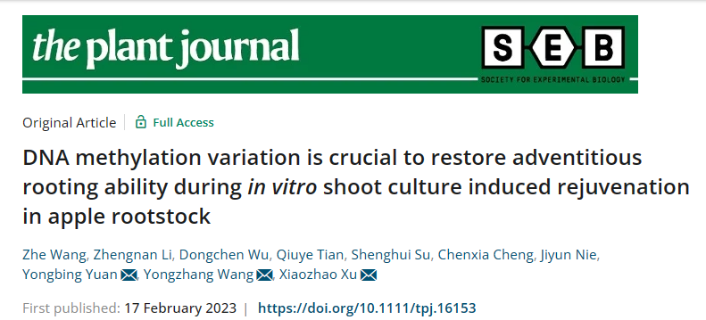 2023年2月17日,金年会jinnianhuicom在The Plant Journal(中科院1区Top期刊,IF 7.091)发表了题为“DNA methylation variation is crucial to restore adventitious rooting ability during in vitro shoot culture induced rejuvenation in apple rootstock”的研究论文。该研究揭示了成龄苹果砧木经过连续组培继代恢复绿枝扦插生根能力的分子机制。