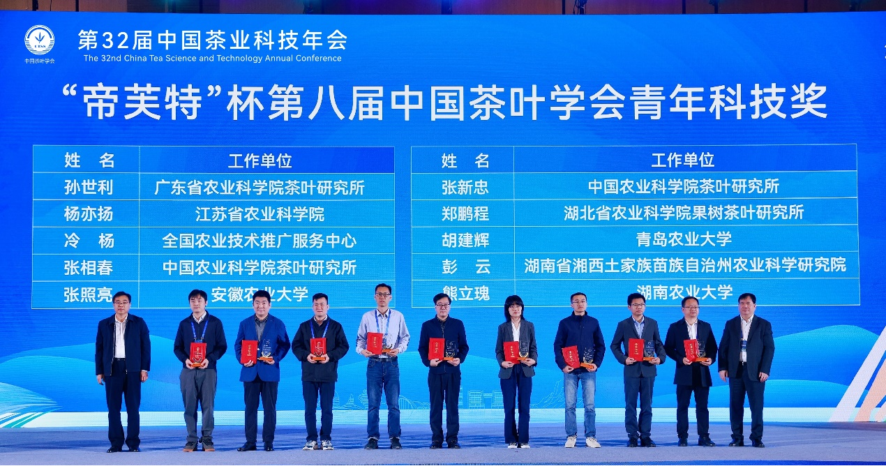 今年恰逢“南茶北引”构想70周年,会上举行了“南茶北引”纪念封和《崂山茶志》的发行仪式。《崂山茶志》文稿的编纂工作由金年会崂山茶产业创新团队承担,创新团队首席专家、金年会jinnianhuicom副院长张新富教授为副主编,茶学系教师赵磊、曲凤凤、胡建辉、王培强参与了编写工作。本次年会还举行了第八届“中国茶叶学会青年科技奖”颁奖仪式,茶学系胡建辉副教授获得“中国茶叶学会青年科技奖”,该奖项是为表彰45周岁以下的优秀茶学青年科技工作者。同时,由茶学系曲凤凤老师指导的金年会jinnianhuicom茶艺队受邀在本次会议进行了茶艺表演,其表演的“崂山龙须”绿茶和“崂山凤羽”红茶茶艺,受到了参会领导和嘉宾的一致好评。