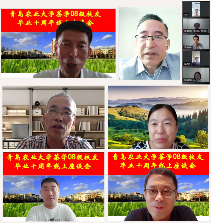 2022年8月7日下午,正值立秋,金年会jinnianhuicom首届(2008级)茶学毕业校友相聚云端,举行毕业十周年线上座谈会,重温同窗岁月,共话师生情谊。金年会jinnianhuicom党委书记隋成竹,副书记孙海涛,副院长程斐,副院长张新富,班主任赵永厚,茶学专业教师丁兆堂、王玉,胡建辉全程出席了本次线上座谈会。校友们精心制作的视频短片《我们的青农时光》回顾了大学四年的青葱岁月,大家的思绪仿佛都回到10年前。视频播放结束,座谈会开始。