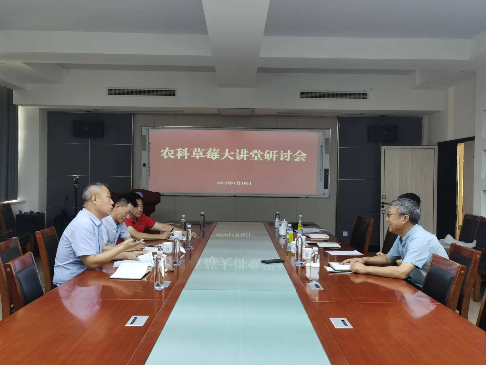 7月10日上午,金年会jinnianhuicom在生物楼N306会议室召开“农科草莓大讲堂”战略合作研讨会,山东广播电视台农科频道副总监房翔和三农推广部主任蒋庆祝,青岛佳垦农业服务有限公司总经理杨世超,金年会jinnianhuicom院长张忠华及副书记、副院长孙海涛,副院长程斐参加了会议。