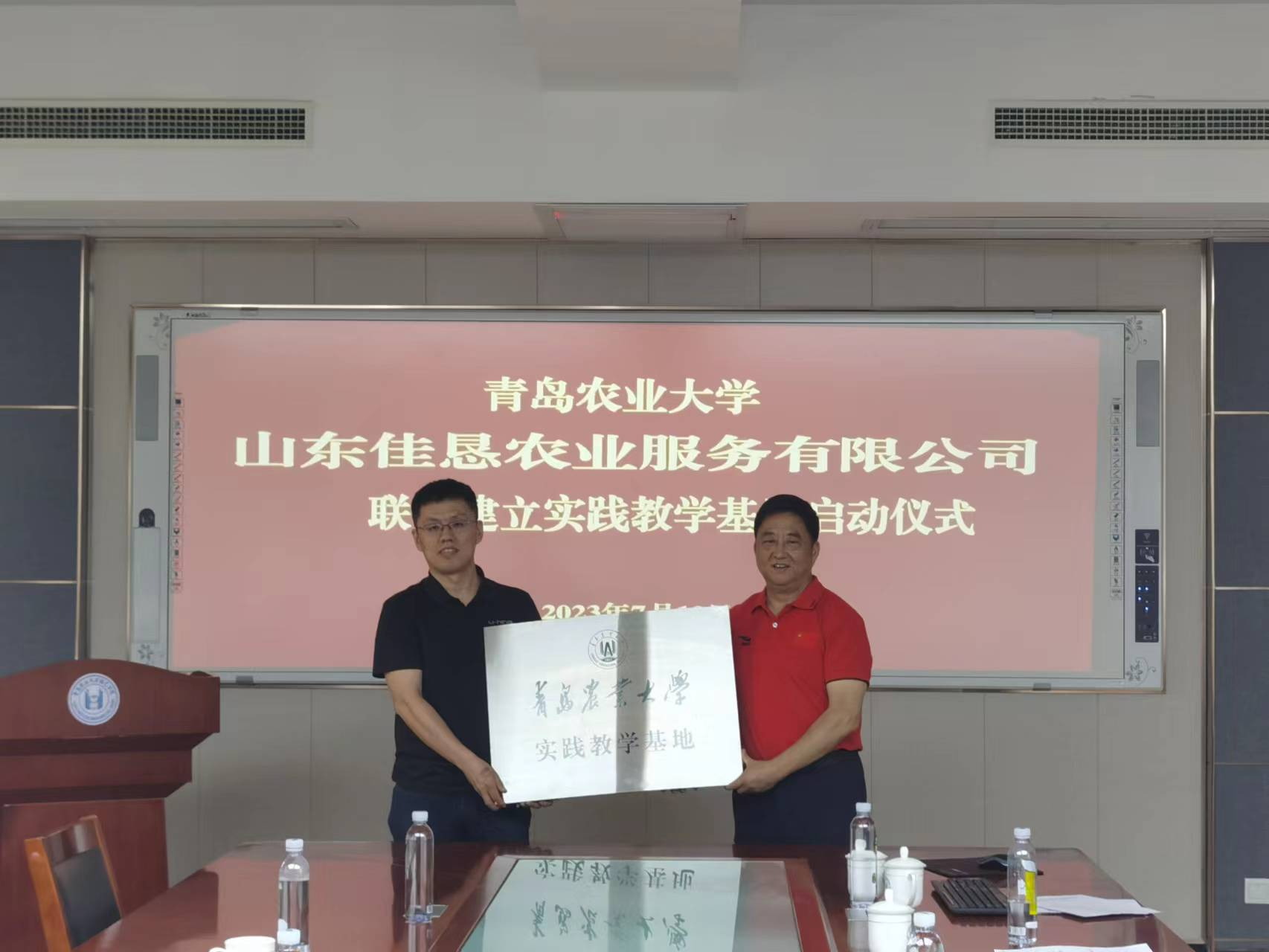 会上,金年会jinnianhuicom与山东佳垦农业服务有限公司举行了联合建立实践教学基地授牌仪式,张忠华院长和杨世超总经理代表双方进行了授牌交接。
