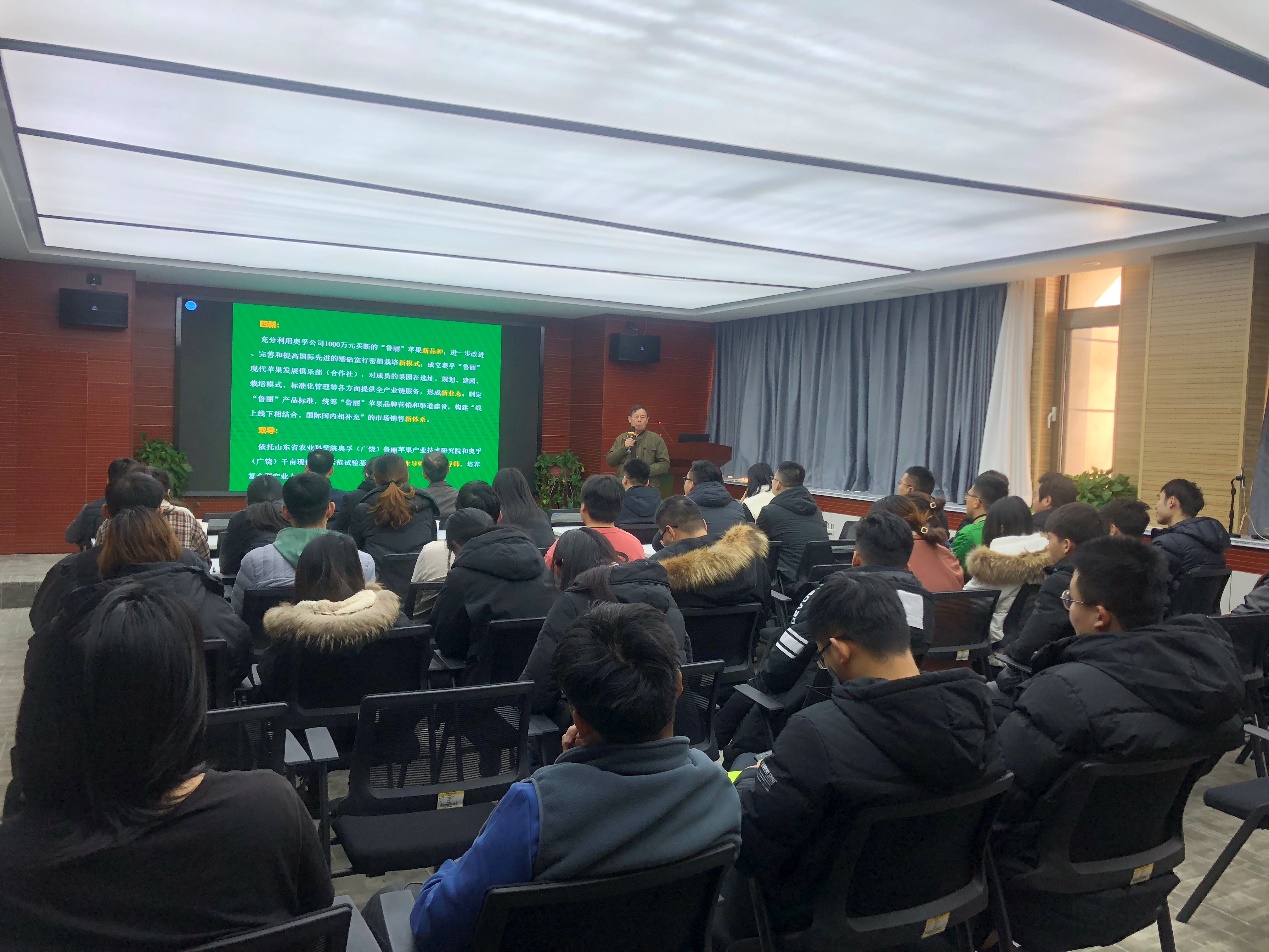 李元董事长简要介绍了我国现代苹果产业现状,并做了题为《关于创建“现代苹果‘四新双导’产业和人才孵化器”的设想》的专题报告。奥孚果业针对目前我国苹果产业发展中的难点问题,创造性地给出了‘奥孚模式’的解决方案。同时在企业发展的过程中,奥孚果业也认识到农业人才匮乏是制约农业现代化发展的深层次瓶颈问题。因此,提出建立大学生现代苹果产业就业创业园区的设想,在园区内建立“现代苹果‘四新双导’产业和人才孵化器”。在该模式下,大学生或者研究生毕业后在稳定就业的基础上,实现就业创业一体化,经过几年的实践锻炼,可迅速提升实践技术水平,平稳度过职业生涯“沼泽区”,真正成长为懂专业、会管理、善经营的现代苹果产业的骨干人才。
