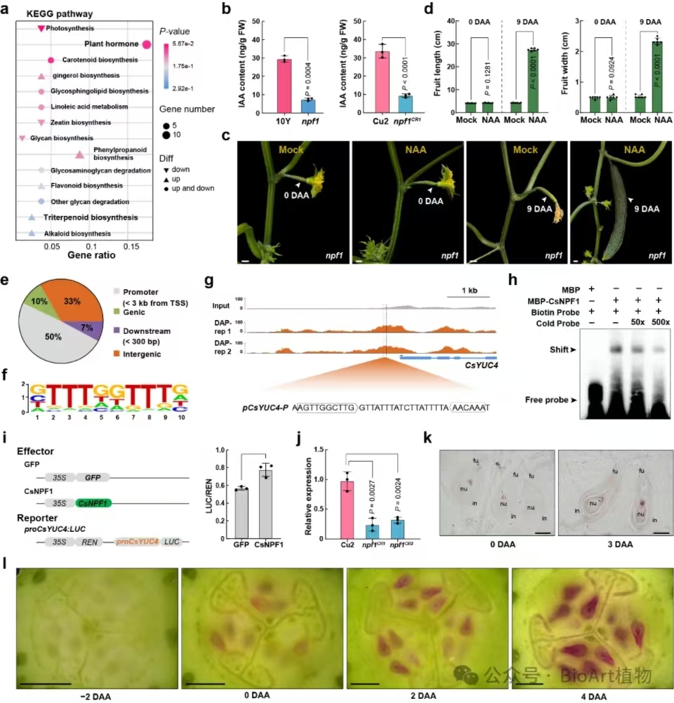 为进一步解析CsNPF1调控单性结实的分子机制,研究人员进行了Dap-seq和RNA-seq分析,挖掘出CsNPF1转录因子的全基因组调控网络。结果显示,生长素信号途径在该调控网络中显著富集,CsNPF1能够直接结合生长素合成基因CsYUC4的启动子并激活其表达,从而提高胚珠中生长素水平,促进单性结实形成(图2)。随着单性结实果实的发育,胚珠中的生长素水平逐渐升高(图2,DR5::RUBY报告基因显示)。 .jpg)