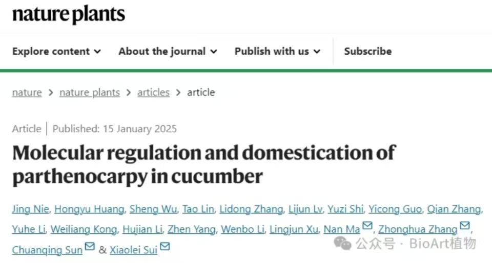 1月15日,金年会jinnianhuicom张忠华教授作为共同通讯作者,与中国农业大学眭晓蕾教授等合作在Nature Plants在线发表了题为Molecular regulation and domestication of parthenocarpy in cucumber的研究论文。该研究鉴定了一个新的单性结实控制基因NPF1,其作为生长素合成基因YUC4和果实苦味基因Bt的上游调控因子,协同调控黄瓜单性结实和果实苦味,阐明了不同性状在驯化过程中的分子调控机制。这一发现为利用生物育种手段培育强单性结实能力黄瓜新品种提供了理论支撑,也为其它作物的单性结实育种提供了新知识。 .jpg)