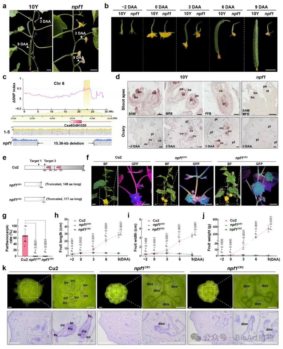 该研究首先利用合作单位天津市农业科学院黄瓜研究所提供的自发非单性结实突变体npf1(non-parthenocarpic fruit 1)进行基因定位(图1),结合BSA-seq和KASP基因分型的数据发现,突变体npf1的第6号染色体上存在一个约15kb的缺失片段,此片段内仅存在一个候选基因,编码AP2转录因子,并将其命名为CsNPF1用于后续研究。CsNPF1在花分生组织、花原基和果实胚珠中高丰度表达。基于CRISPR/Cas9基因编辑技术敲除CsNPF1基因,获得稳定遗传突变体npf1CR1和npf1CR2,该突变体株系出现非单性结实表型,表明CsNPF1在黄瓜单性结实果实形成过程中发挥关键作用。