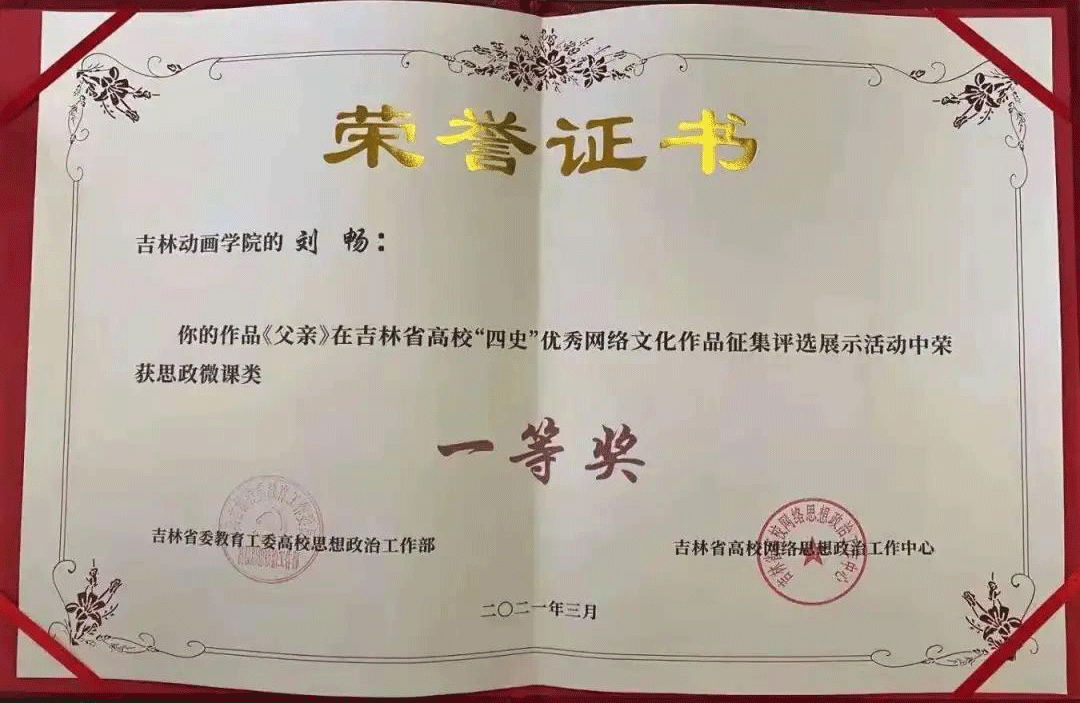 为深入贯彻落实习党史、新中国史、改革开放史、社会主义发展史(简称“四史”)学习的重要指示精神,持续深化爱国主义教育,吉林省委教育工委高校思政部、省高校网络思想政治工作中心联合组织开展了全省高校“四史”优秀网络文化作品征集评选展示活动。经过专家评审,五大类作品共评选出一等奖32个,球王会官网动画艺术学院的作品《父亲》和《爷爷的故事》荣获“思政微课类”一等奖。