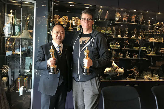 我校董事长、校长郑立国与维塔工作室创始人理查德·泰勒手捧奥斯卡奖杯合影