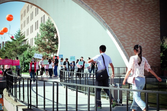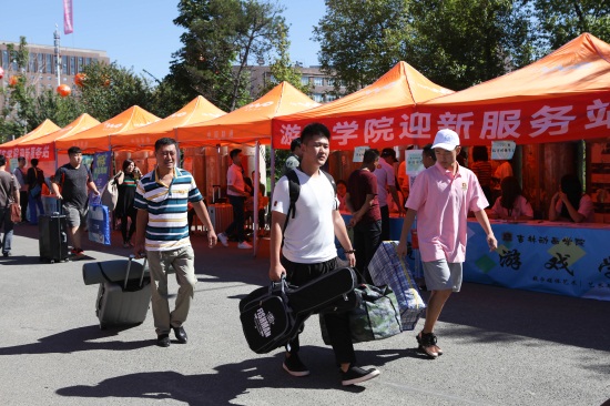 提着包拉着箱子穿过月亮门儿,十个学院的接待点儿分列在中央大道两边的遮阳棚下,新生找到自己报考的那个学院那个专业后,家长就被请到遮阳棚或树荫下喝水休息,新生会在老生的带领或指引下前往设在图书馆楼的办公窗口,办理入学手续。迎新办公室的负责人说:让学生自己办理入学手续,就是让他们从踏入校门开始学会独立,而不再依赖家长。这是秉承球王会官网“自尊自强创新创造”的校训精神做出的规定。