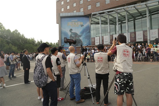 面对着楼门前的合影台,一群身穿摄影背心的人们正在调试三脚架上的照相机、摄像机,他们身穿的摄影背心上印着“动画摄影”的字样。
