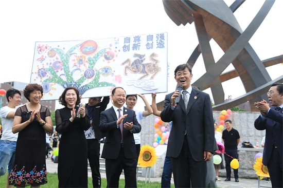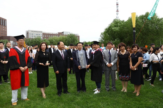 产品造型学院将手工制作的“挂表”送给学校,董事长、校长郑立国带领学校领导们席地而坐,与毕业生们团团围坐在一起合影留念,气氛温馨感人。