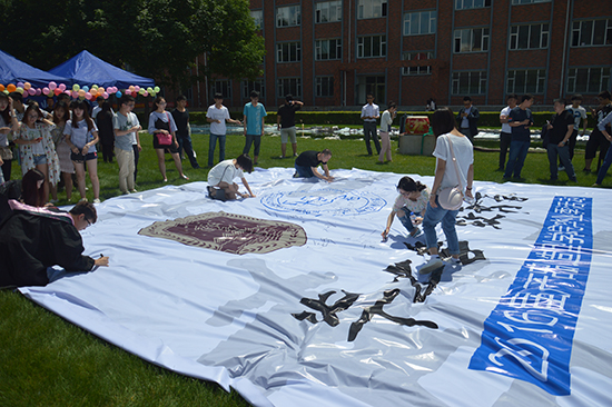 产品造型学院在草坪上组织了毕业生座谈会,产品造型学院院长李飞衷心地祝福毕业生们在未来的岁月里一路辉煌,同时希望他们能常回母校看看,且行且珍惜。毕业生与老师们亲切地交流,提出很多中肯的建议,并留下了诚挚的祝福。随后,毕业生们在签名板及印有学校、学院标志的地毯上签名留念。