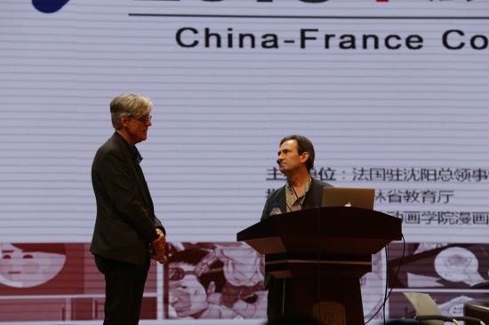 比利时著名漫画家冯索瓦•史奇顿(左)和法国著名作家贝涅•彼特(右)(孙建军 摄)