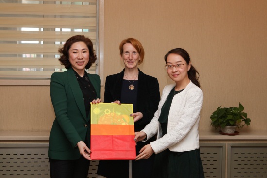 英国朴茨茅斯大学国际项目协调员布莱欧妮•怀特玛什(中)、中国办公室市场与开发主管宋琳(右),与学校副董事长、副校长刘欣(左)互赠礼品(刘子铭 摄)