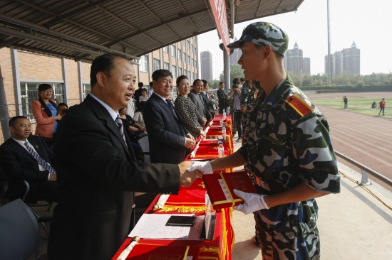党委书记、副校长王清山为军训标兵代表颁发证书和锦旗(刘子铭 摄)