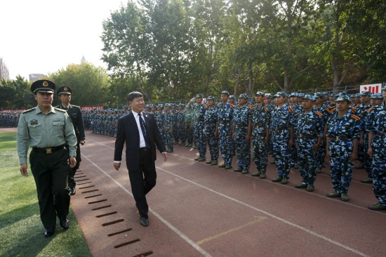 学校党委书记、副校长王清山代表董事长、校长郑立国检阅新生军训队伍(刘子铭 摄)