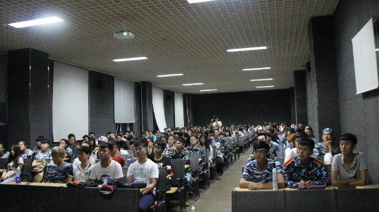 2015级新生认真听取新生入学教育报告(唐管华 摄)