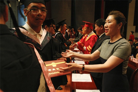 在欢快的音乐声中,学校领导为毕业生代表颁发毕业证书,为优秀毕业生代表颁发优秀毕业生证书,为获得毕业生单项奖的代表颁发证书。学校董事长、校长郑立国和总督学、学位评定委员会主任于庚蒲为获得学士学位的毕业生代表授予学位,并颁发学位证书。