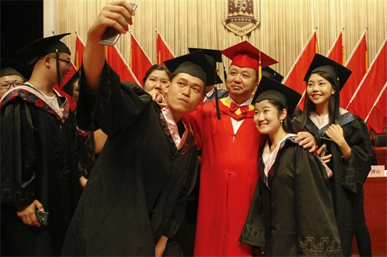 董事长、校长郑立国和总督学、学位评定委员会主任于庚蒲与毕业生代表合影