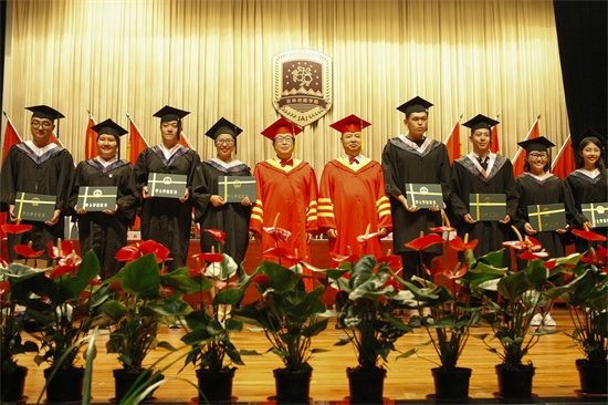 董事长、校长郑立国,总督学、学位评定委员会主任于庚蒲为获得学士学位的毕业生代表授予学位并拨流苏