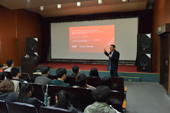 讲座中,胡镜泉院长以广告公司运营管理者的丰富经验,详尽地为师生们介绍了广告公司整体架构及主要部门的工作职责,讲解了“大广告”产业链中企业品牌及广告的制作流程。